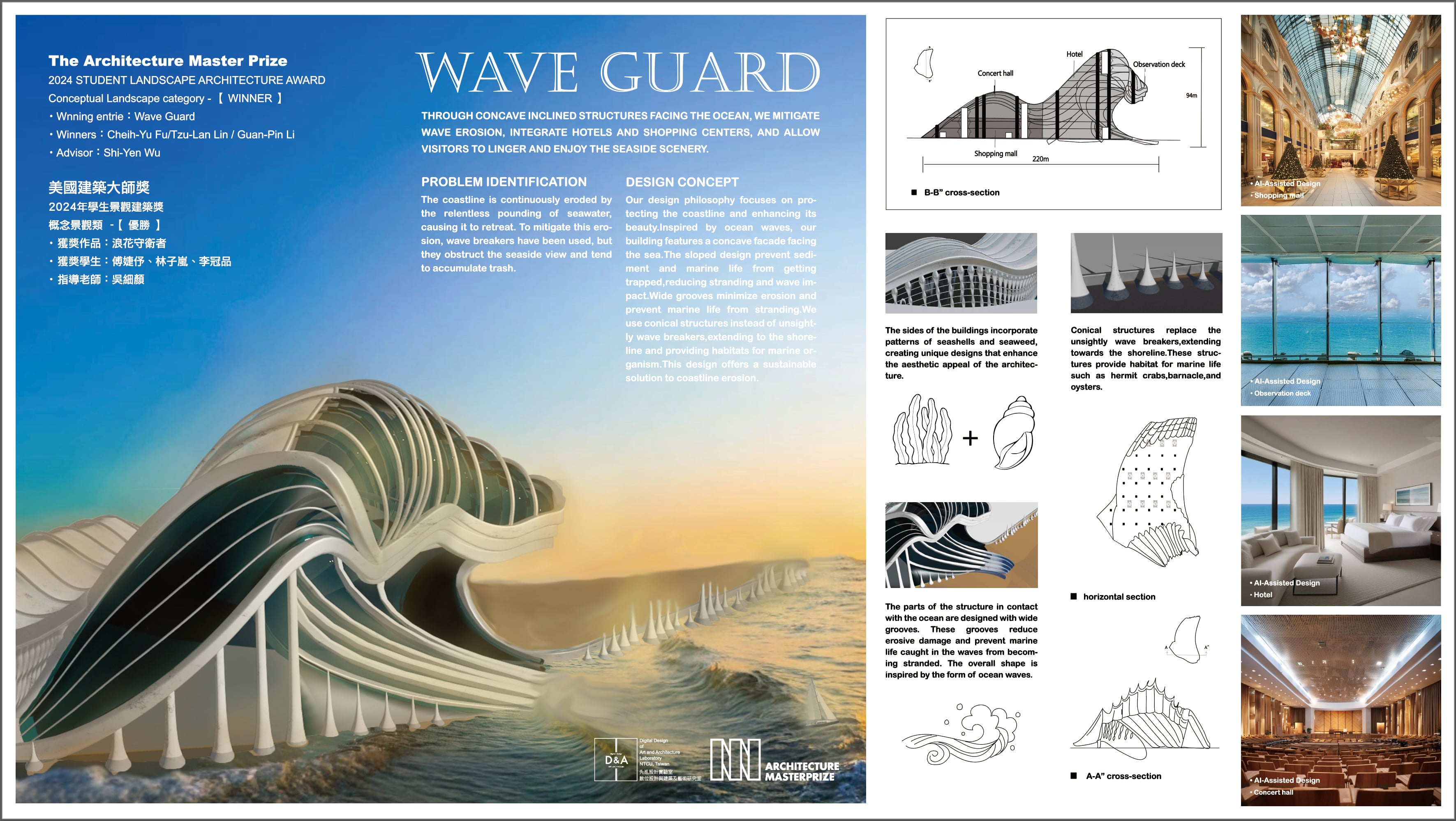 我們的設計理念專注於保護海岸線並提升其美感。靈感來自海浪,我們的建築採用面向大海的凹形立面設計。這種傾斜設計有助於防止沉積物和海洋生物被困,從而減少擱淺情況以及波浪衝擊。寬大的凹槽可有效減少侵蝕並防止海洋生物擱淺。我們使用錐形結構代替不美觀的消波堤,這些結構延伸至海岸線,為海洋生物提供棲息地。此設計為海岸侵蝕提供了一個可持續的解決方案。