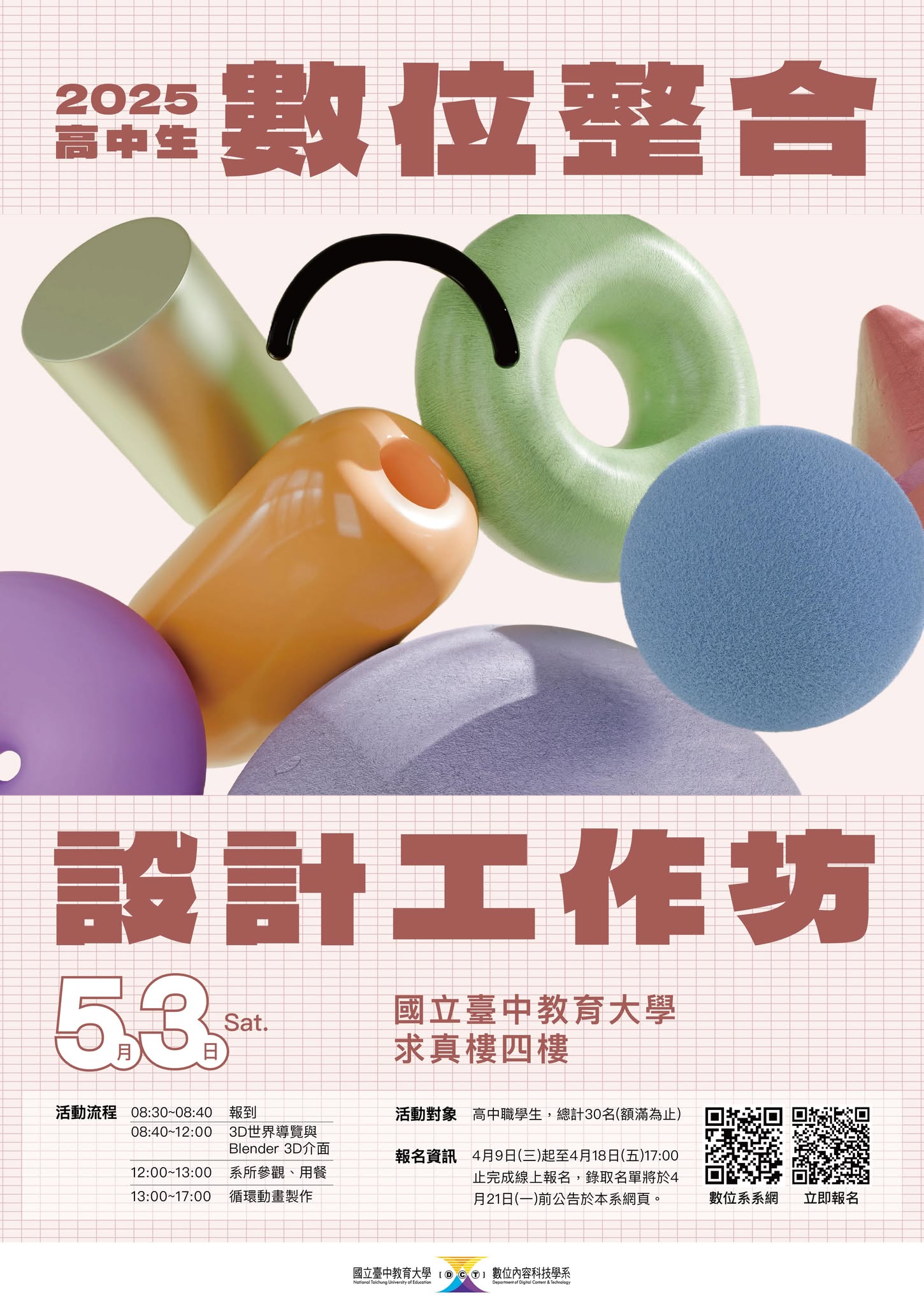 活動報名:114年4月9日(三)起至4月18日(五)17:00止完成線上報名(https://reurl.cc/zq8vdk),或可參閱本系系網(https://dct.ntcu.edu.tw/index.php)。錄取名單將於114年4月21日(一)前公告於本系網頁。